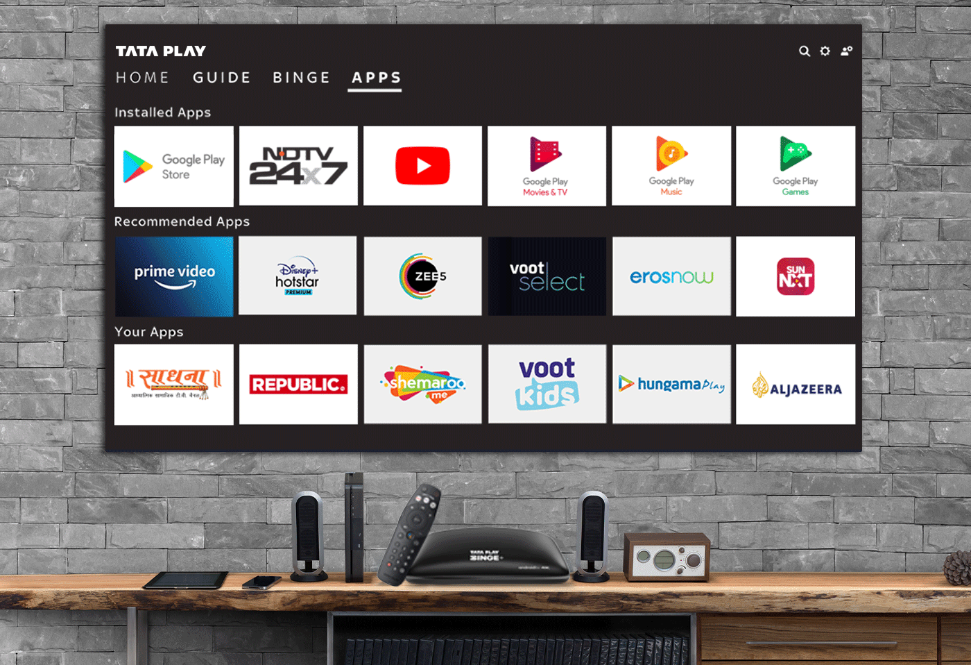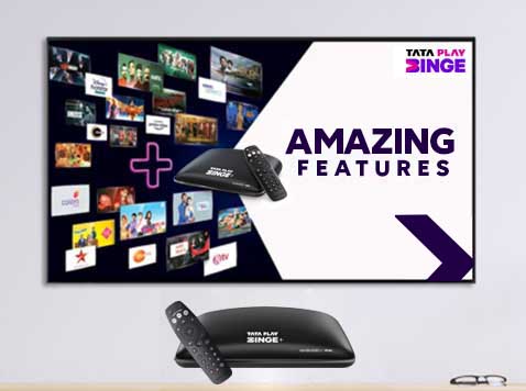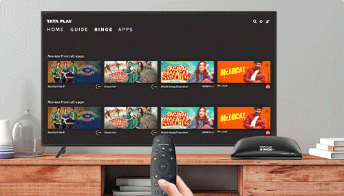 Tata Play Binge+ Set Top Box lets subscribers watch both live TV and OTT content (when connected to internet) on one device, without switching between multiple HDMI ports. OTT content that the user can watch on this Set Top Box includes VOD, 7 days catchup shows from Tata Play and content from Apps like